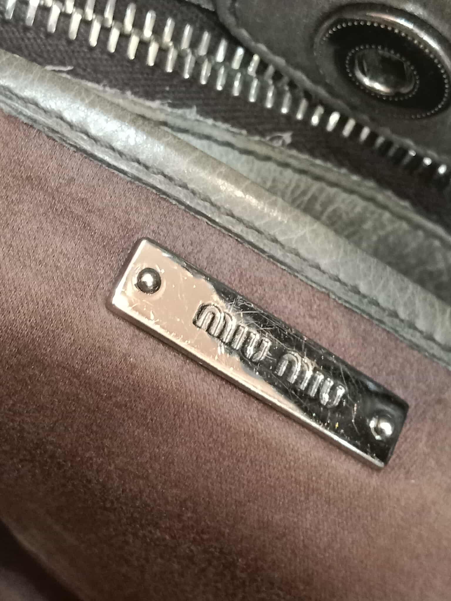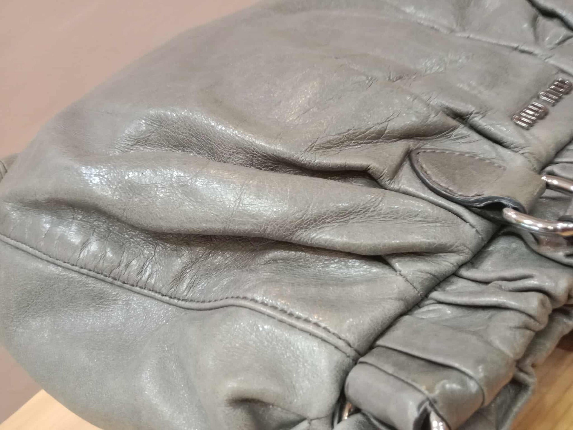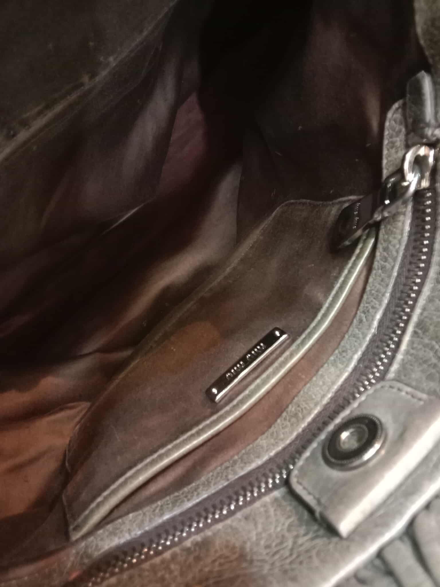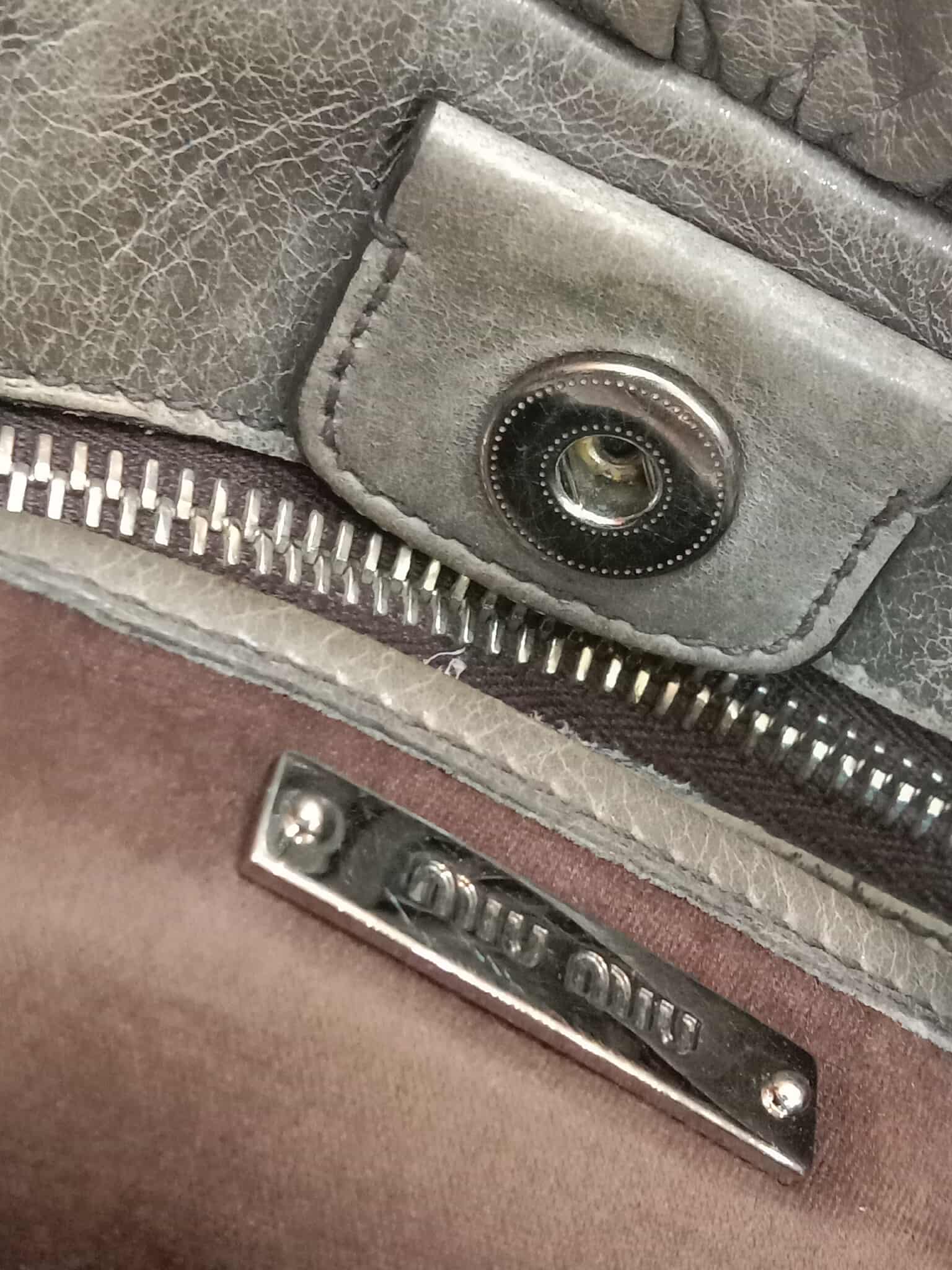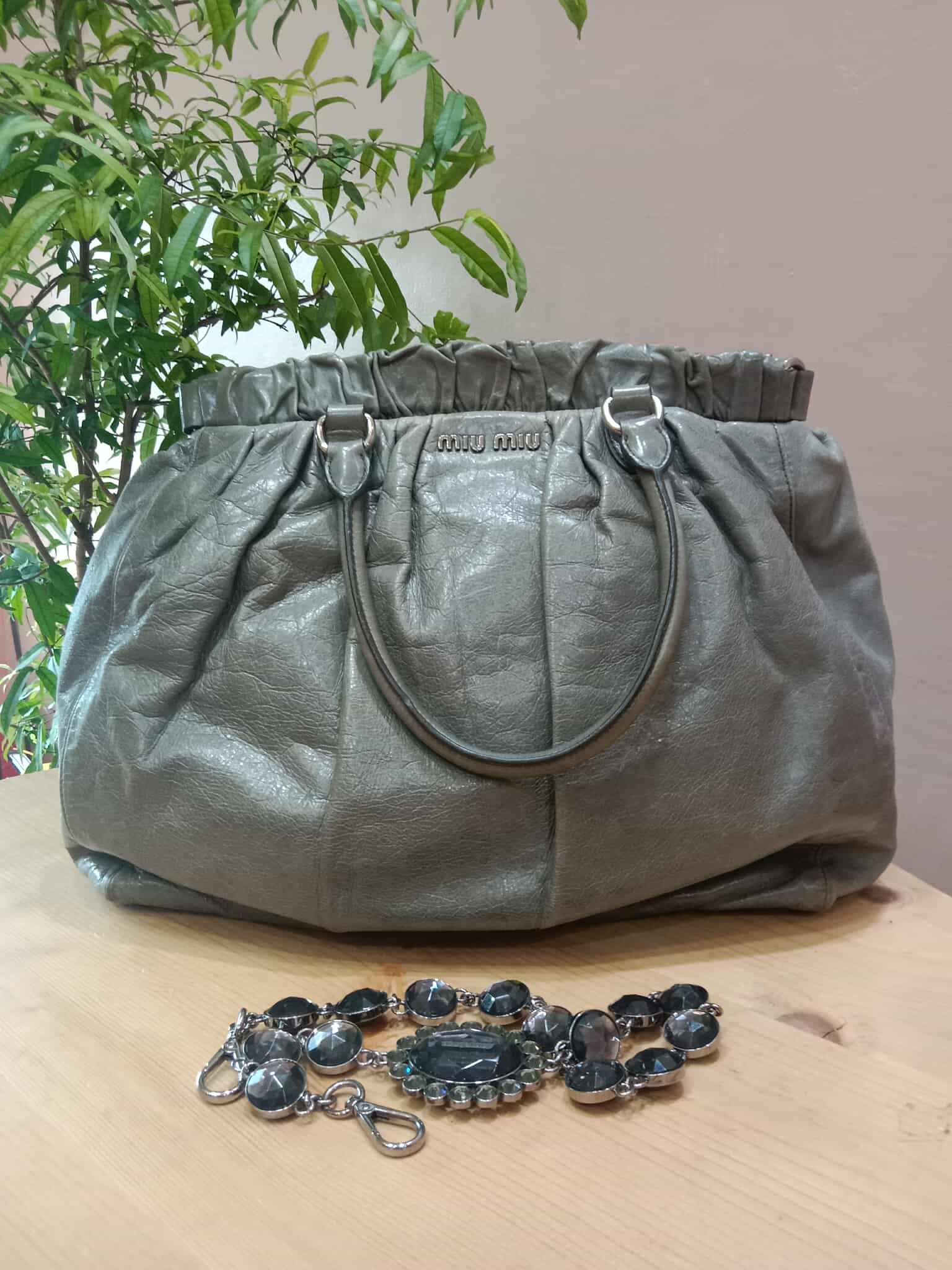 Miu Miu Leather Tote Bag Grey with Crystal Embellished Strap